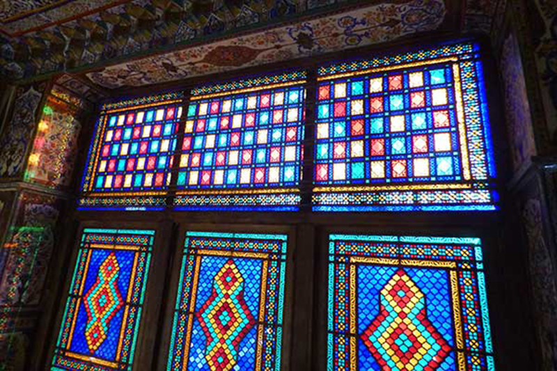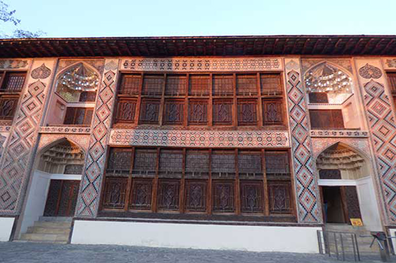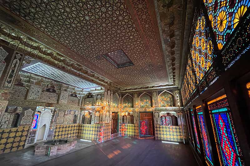 内部に足を踏み入れると、壁や天井を埋め尽くす装飾と、「シェベケ」と呼ばれる伝統的な木組みと色ガラス窓が目に入る。これは釘を使わずに組まれたアゼルバイジャン独自の技法で、その細工は光をやわらかく分解し、室内に静かな彩りをもたらす。ここではシェベケは技巧の誇示ではなく「空間の性格を整えるための要素」として、控えめに使われている。