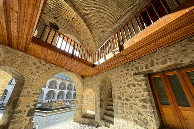 大きな扉を潜りキャラバンサライに足を踏み入れると、規則正しく並ぶアーチ、回廊状に巡らされた通路、中央に据えられた中庭の静けさが、どこか修道院の回廊を思わせる。