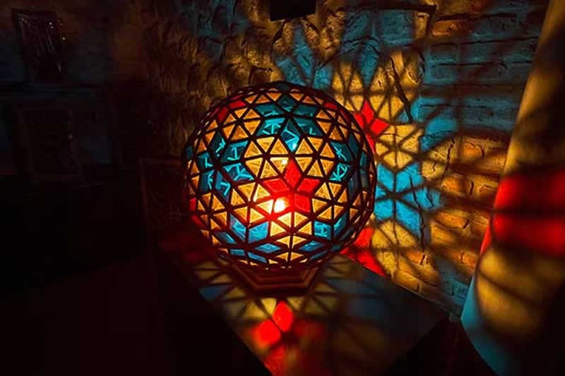この技法が発達した背景には、シルクロードの交差点に位置したこの地域ならではの文化の混ざり合いがある。ガラスの透明性と木工の精緻さ、幾何学文様への美意識── 遠くの文化が通り過ぎ、土地の手仕事と出会い、静かに形を結んだのがシェベケである。
